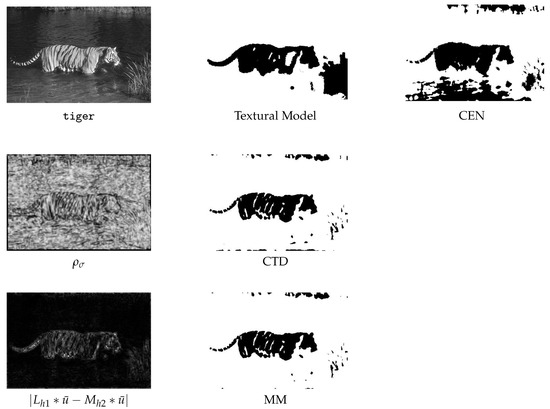 The latter observation is confirmed by the experiments performed on tiger. Table 3 reports the corresponding model and algorithmic details, while the segmentations are shown in Figure 4 along with (visual) information on quantities used to define (see (8) and (10)). We see that the CTD and MM strategies produce satisfactory results, although they have been obtained by generalizing a non-textural model.