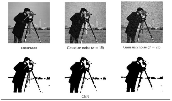 Segmentations of cameraman and its noisy versions by using CEN and the spatially adaptive models: parameters and iterations. The value of is the same for all of the models, thus it is reported only once per image.