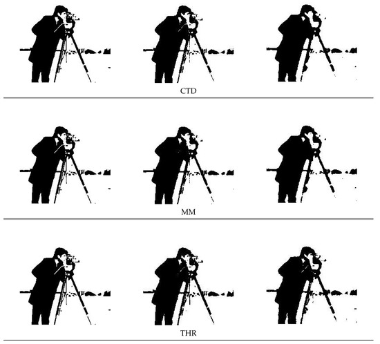 Segmentations of cameraman and its noisy versions by using the CEN, CTD, MM, and THR models.