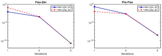 We first examine Theorem 3 by using two pairs of data matrices and which come from a publicly available handwritten numerals dataset (https://archive.ics.uci.edu/ml/datasets/Multiple+Features). It consists of features handwritten numerals (‘0’–‘9’) and each digit has 200 patterns. Each pattern is represented by six different feature sets, i.e., Fou, Fac, Kar, Pix, Zer and Mor. Two pairs of feature sets Fou-Zer and Pix-Fou are chosen for and , respectively, such that and in Fou-Zer, and and in Pix-Fou with . To make the numerical example repeatable, the initial vectors are set to be