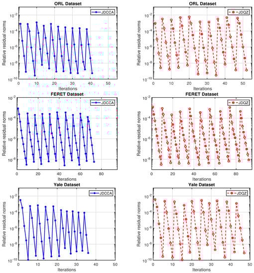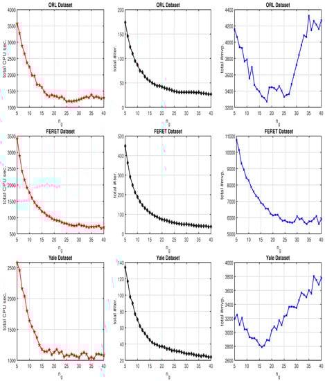 As stated in Algorithm 1, the implementation of JDCCA involves solving the correction Equation (22) in every step. Direct solvers mentioned in Example 1 referring to operations are prohibitively expensive in solving large-scale sparse linear systems. In such a case, iterative methods, such as MINRES method which is simply GMRES [] applied to symmetric linear systems, are usually preferred. In this example, we report the effect of the number of steps in the solution of the correction equation, denoted by , on the total number of matrix-vector products (denoted by “#mvp”), outer iteration number (denoted by “#iter”), and CPU time in seconds for Algorithm 1 to compute the first 10 canonical weight vectors of the test problems appeared in Table 1. Table 1 presents three face datasets, i.e., ORL (https://www.cl.cam.ac.uk/research/dtg/attarchive/facedatabase.html,) FERET (http://www.nist.gov/itl/iad/ig/colorferet.cfm) and Yale (https://computervisiononline.com/dataset/1105138686) datasets. The ORL database contains 400 face images of 40 distinct persons. For each individual, there are 10 different gray scale images with pixels. These images are collected by volunteers at different times, different lighting and different facial expressions (blinking or closed eyes, smiling or no-smiling, wearing glasses or no-glasses). In order to apply CCA, as numerical experiments in [], the ORL dataset is partitioned into two groups. We select the first five images per individual as the first view to generate the data matrix , while the remaining for . Similarly, we get data matrices and for the FERET and Yale datasets. The numbers of row and column of and are detailed in Table 1.