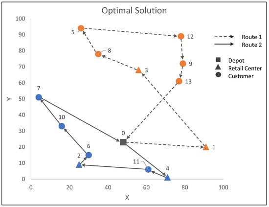 Table 1 provides the details for a small-sized instance, which is composed of one central warehouse, four retail stores, and nine online customers. For this instance, Table 1 provides: the geographic coordinates (X and Y) of each node, the demand required from the depot by each retail center , the demands for each customer j for each product type q (), and the inventory of each available product , at the retail centers. Since the products are negligible in terms of capacity, they do not affect the vehicle load capacity. Accordingly, Figure 2 presents the optimal solution for the provided example. The routes are performed with a total cost of distance units, and a fleet of vehicles each with a capacity of 100 weight units is employed for performing the routes. In the first route, customers 8, 5, and 9 are served by retail center 1, while customers 12 and 13 are served by retail 3. The route requires distance units, and the vehicle starts with 93 loaded demand units. Note that the retail centers are first visited by the vehicle in order to deliver the required demand from the depot and to pick-up the products ordered by the customers. Similarly, in the second route, customers 11 and 10 are supplied by retail center 4 while customers 6 and 7 are served by retail store 2. The route requires distance units, starting with 79 loaded demand units.