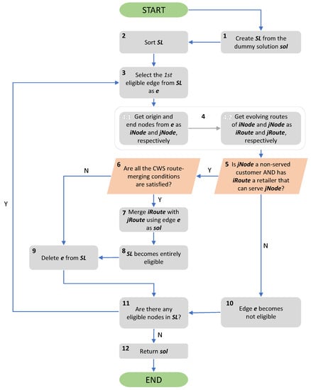 Figure 3. The flowchart of CWS.Initially, a savings list (SL) is constructed (step 1). This list considers all possible pairs of nodes–i.e., edges–from the problem. For each edge , the corresponding savings value is calculated as , where represents the deterministic travel time between nodes i and j. That is, candidate solutions are generated using ‘ideal’ traffic conditions for the edge-traversal times.Initially, all edges from SL are eligible. The list is sorted in descending order of the savings value (step 2), and the edge with the highest saving is selected (step 3). At this stage, the selection of edges is restricted to guarantee the assignment of a retail center to each consumer in the problem (step 5). In other words: a route containing one single customer can only be merged with a route containing a retail center, i.e., the selection is restricted to eligible edges , where node j is a consumer in a dummy route and i is a node in a route with a retailer that can supply consumer j. According to Martins et al. [9], these attempts at only merging routes containing at least one retail center, which can supply a single consumer, are made first in order to avoid infeasible solutions–i.e., solutions in which some customers are not assigned to any retailer. This approach of addressing solution feasibility first is based on the observation that the availability of feasibility restoring merges will only decrease as the algorithm progresses.Based on CWS route-merging conditions (step 6), the two corresponding routes, i and j, of an edge (obtained in steps and ) can be merged only if: (i) nodes i and j are exterior in their respective routes (a node is exterior if it is adjacent to the depot); (ii) i and j belong to different routes; (iii) the maximum tour length is not violated; and (iv) the vehicle capacity is not violated.The selected edge is deleted from SL (step 9) only if: (a) the corresponding merge is performed (step 7); or (b) at least one of the CWS constraints ((i)–(iv)) are violated (in step 6). Otherwise, the edge becomes temporarily ineligible (step 10), but it is not removed from the list since subsequent merges might restore eligibility. This can occur when a different retail center is merged into a route, increasing the available processed inventory for subsequent consumers. For example, when selecting an edge , the evolving route of i may have insufficient processed inventory for customer j at this time. However, if in subsequent iterations route i is merged with another route containing retailers, the evolving route of i may then be able to serve customer j.When a merge is successfully performed (step 7), the entire SL becomes eligible (step 8), since a new inventory scenario is generated.At the end of this stage, all the consumers are supplied by the retail centers, guaranteeing a feasible final solution. Notice that this is achieved without solving separate assignment and routing problems, as done in Abdulkader et al. [1]. - Finally, the third stage (CWS) tries to improve the solution generated in the previous step. To do that, the algorithm cycles through the SL list, which includes the remaining saving edges that were discarded in the previous step, with the aim of identifying more beneficial merges. Unlike the procedure used in the CWS stage, in this phase all the customers are already assigned to a retail center, so step 5 of Figure 3 is not required. Hence, all edges are eligible. The process attempts all the available merging possibilities which may improve the solution. Each time a new edge is selected from the SL list, it is removed from the list, whether the corresponding merge is performed or not–due to it violating any of the constraints (i)–(iv). In each new iteration, the highest saving edge is selected to restart the merge process. This process is repeated until SL is empty. At the end of the procedure, a feasible solution is generated, without the necessity of repair operations.