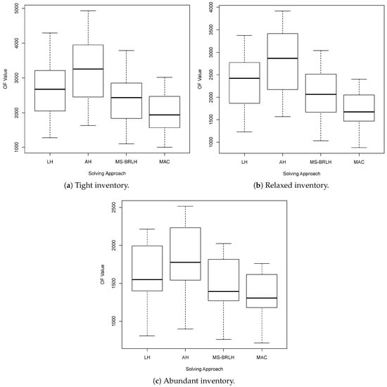 By analyzing Table 3, Table 4 and Table 5, we can observe that our MSBRLH algorithm is able to improve previous results (from LH) by 9–12%, on average (column gap (2)–(1)). When comparing the MSBRLH with the AH heuristic (column gap (3)–(2)), our approach is able to reduce solution costs by up to 26% in short computational times (about 18 s on average). On the other hand, when comparing our results with those generated by the MAC approach (column gap (4)–(2)), our solutions are between 9% and 21% worse, on average. Particularly, in the abundant inventory scenario, MSBRLH’s results are only 9% worse than MAC. Notice, however, that the processing time required by MAC is substantially larger in all inventory scenarios. By analyzing Figure 4, it is evident that MSBRLH performs better in the abundant inventory scenario, being able to find one better solution and several others with a maximum gap of 8%. Moreover, we can observe a variability of around 10% in the gap between MSBRLH and MAC on average. This variability is reduced to around 8% for the relaxed and abundant scenarios. These results demonstrate the robustness of our solution approach for the deterministic case. When analyzing Figure 5, which presents the overall performance of each solution approach for each inventory scenario, we can observe that our multi-start strategy is more efficient than both LH and AH heuristics, by generating solutions with a lower cost. To complement these box-plots, an ANOVA test was run for each inventory scenario. The p-values associated with the tight, relaxed, and abundant inventory scenarios were, respectively, of , , and . Also, the Fisher’s LSD test suggests significant differences in all tree scenarios between MAC and AH, between MS-BRLH and AH, as well as between MAC and LH. However, cost differences between MAC and MS-BRLH were not significant in any scenario, despite the fact that MAC employed a noticeably higher amount of computing time than MS-BRLH.