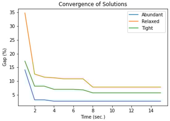 As we can see in Figure 6, the instances demonstrate the same convergence behavior as solution time increases. It is noticeable that the convergence rate is abrupt during the first few seconds. However, contrary to the tight and relaxed inventory scenarios, where the solutions continue improving over time, the search demonstrates more stable convergence during the remaining execution time in the abundant scenario. Being more efficient in the more flexible inventory case, our multi-start approach quickly achieves its best solutions.