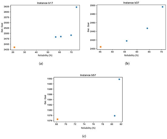As we can see in Table 6, all the SimBRLH solution costs are between the LB and the UB, as expected. For 24 problem instances, the solution returned by our simheuristic is better than the best deterministic solution when it is tested in the stochastic scenario (the column). From this, we can assert that our SimBRLH is able to generate competitive results for the stochastic scenario. The reliability value is calculated by simulation for each solution and represents the probability that all routes are completed within maximum tour duration. For visualizing this trade-off between the deterministic cost of the solutions and their reliability rate, which are conflicting objectives, a Pareto frontier of non-dominated is presented. Accordingly, Figure 7a–c present the non-dominated solutions for three different instances (, , and ), each one belonging to a different inventory scenario. A solution is non-dominated if, no other solution has a greater reliability and a lower or equal travel cost, or if no other solution has a lower travel cost and a greater or equal reliability level. The solution was randomly chosen, while the and solutions are for the same problem but set in the two other inventory scenarios. The square orange dot represents the best deterministic solution found by our MSBRLH, while the remaining ones, round and blue, represent different solutions with a higher reliability rate, but with higher operating costs.