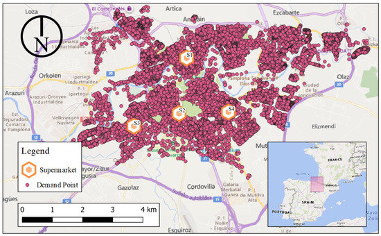 The interest of analysing the e-grocery demand in a medium sized city is three-fold. Firstly, the e-grocery penetration is lower and customers’ characteristics heavily differ from those in large cities [46]. Secondly, the transportation infrastructure is usually poorer than in large cities, which makes transportation activities less efficient [47]. Thirdly, the literature review has revealed a lack of research focused on small and medium cities, being large cities the center of attention in most of the research. Therefore, the geographical scope of our experiment is Pamplona area in Northern Spain, which includes a population of about 250,000 inhabitants. Figure 1 shows the location of the city in Spain and demand and supply points, where purple dots stand for demand locations and hexagon marks stand for the selected supermarkets for the experiments.