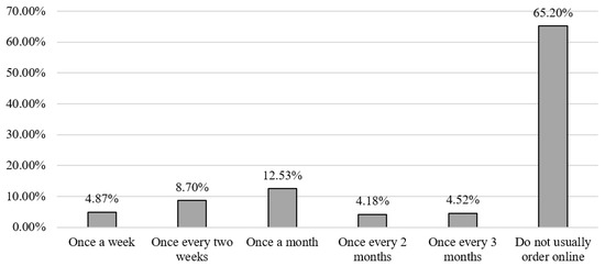 Analysing carefully the survey, we can highlight the main aspects related to the e-grocery demand patterns in Pamplona. Firstly, there are four main supermarkets for ordering online. They are detailed in Table 1. Thus, we will use these four supermarkets for our simulation model. Secondly, most of the participants do not usually order groceries online. About a 25% of the total order e-groceries at least once a month. The frequency of ordering is provided in Figure 2. Third, delivery preferences are basically during the weekdays at the 19-22 h time window. The detailed delivery preferences are provided in Figure 3.
