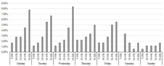 With the information previously obtained, we can estimate the expected demand, that is, number of orders, for the considered supermarkets. These estimations, shown in Table 2, are the main input for our simulation model. In particular, we first computed the expected weekly demand at the last row. These figures were obtained by using the information in Table 1 and Figure 2. Since those computations and experiments have been calculated on a weekly basis, we use a discrete random variable, for computing weekly demands, associated to the customers ordering frequency as it is shown in Figure 2. The possible values of that random variable are: 1 for purchasing once a week, for purchasing once every two weeks, for purchasing once a month, for purchasing once every two months, for purchasing once every three months, and 0 for not ordering online. Additionally, we assume the study area accounts for households. We consider this a good approximation due to the fact that the Pamplona metropolitan area has around inhabitants and the average household size is around people [48]. Therefore, the expected weekly demand for any supermarket is obtained as the product of the random variable, its probability distribution function, and the number of households. Afterwards, the expected weekly demand is distributed among the time windows according to estimated probabilities drawn from the information in Figure 3.