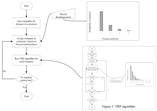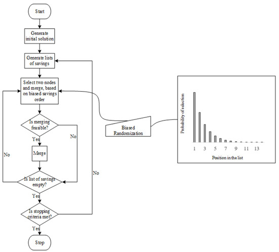 If cooperation is not enabled, each supermarket will serve its customers in an independent way. Consequently, each supermarket has to solve as many Vehicle Routing Problems (VRP) [51] as time window slots it offers to design the orders distribution plans. We have implemented a heuristic algorithm to solve each VRP, which is based on a biased randomization solution procedure of Clarke and Wright’s Savings algorithm [52,53]. Thus, we have followed the instructions given in Grasas et al. [54] and Juan et al. [52] to design our own algorithm to solve the corresponding VRP. In this sense, we use the value for the skewed distribution (a truncated geometrical distribution) mentioned by Grasas et al. [54] with 1000 iterations as stopping criterion. The flowchart of the proposed algorithm is shown in Figure 5.