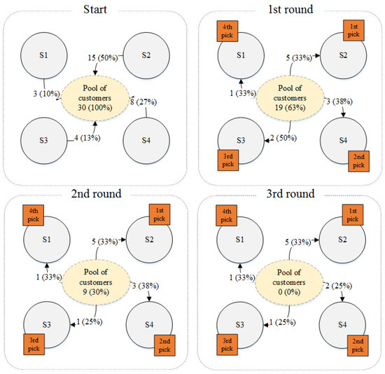 In the intermediate scenario of limited cooperation, companies in the coalition are allowed to share a given proportion of their customers for each logistic service, that is, each time window and day. The cooperative mechanism consists of creating a pool of customers that may be served from other companies in the coalition. We fix the quota for transferring customers to a 50%. Note that, it is based on time-distance (time to make the delivery in the real situation of traffic in a fixed time) to the chosen supermarket. Then, the customers are iteratively assigned to the closest supermarket until the pool of customers is empty. This process is illustrated in Figure 6 for a given time window, where companies transfer a total of 30 customers to the common pool. The initial contributions of each company in the example are 3 customers from , 15 from , 4 from and 8 from . Then, customers are transferred at different rounds until the pool of customers is empty. In this case, there are 3 rounds for assigning the customers. In the first round, the percentage of customers the biggest contributor (supermarket having the greatest number of orders in one day) may pick is bounded by the percentage corresponding to the smallest contributor. Since there are 3 rounds, the smallest contributor is assigned a 33% of customers per round, which means that each company should receive a 33% of their given customers per round. That gives 5 customers to the first picker, that is, . Recall that customers assignment is based on time-distance. Therefore, the 5 closest customers in the pool are assigned to . If the aforementioned proportions do not produce an integer number, as it is the case for and , then the number of assigned customers is rounded up. This process is repeated until all the customers are assigned in forthcoming rounds. Then, the resulting VRP is solved using the biased randomization procedure described in Figure 5. Finally, when customers are served, they are reassigned to the chosen supermarket and this process is restarted for the next time window.