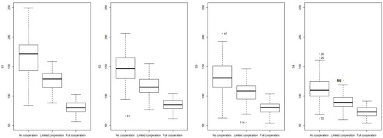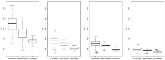 Boxplots for the average distance driven in the 100 replications for non-, limited, and full cooperation settings for each supermarket.