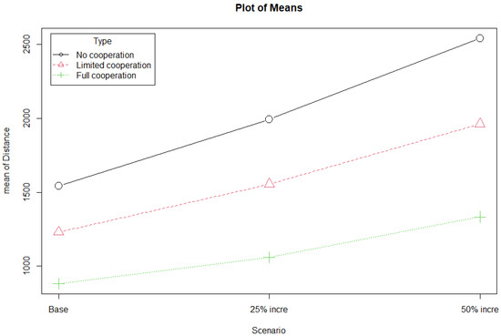 Furthermore, additional scenarios have been analysed in order to demonstrate the robustness of the presented approach, featuring increases on the demand figures. Our aim is showing that the horizontal cooperation benefits are kept when we depict a wide range of scenarios. We consider three demand scenarios. Firstly, the base scenario, which has been already analysed and whose demand is estimated in Section 3. Secondly, a scenario featuring an increase of a 25% on demand figures. Finally, a scenario in which the number of orders increase a 50%. The fleet size is kept fixed for all the scenarios according to the description made in Section 4.3. Table 5 and Table 6 show the KPIs obtained from the results in the mentioned scenarios, that is, distance driven and lead times, respectively. The first row in the tables show the scenarios to be addressed, the second one the cooperative strategy to be employed, the next four rows show the average results for each of the four supermarkets, and the last row the overall average results. As expected, an increase on demand levels produces increments on both the distance driven and the lead times. Nevertheless, it must be highlighted that those increments feature different patterns depending on the cooperation settings. Actually, as it can be observed in Figure 11, the greater the increase on demand figures is, the greater the positive effects on distances are. This is particularly noticeable in the no cooperation settings, where the distance driven increases a 29% and a 65% when demand increases a 25% and a 50%, respectively. However, these increments are lower in the full cooperation environment, a 20% and a 51%, respectively. That is, the slope (i.e., the negative effects) is softer when cooperation is implemented, which leads to a better response to unexpected demand increases. Similar insights can be obtained when analysing the effects on leading times in Figure 12.