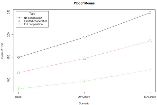 Mean plots by demand scenario and cooperative setting for average lead times.