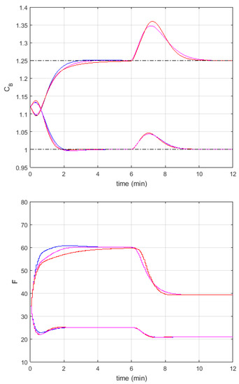 Responses of the control system to changes in the setpoint to mol/L and mol/L and to the change of the disturbance by 10% in the 6th minute of the experiment; ; NMPC—red lines (SSE = 1.2900), FMPC2—blue lines (SSE = 1.2230), FMPC2a—magenta lines (SSE = 1.2183).