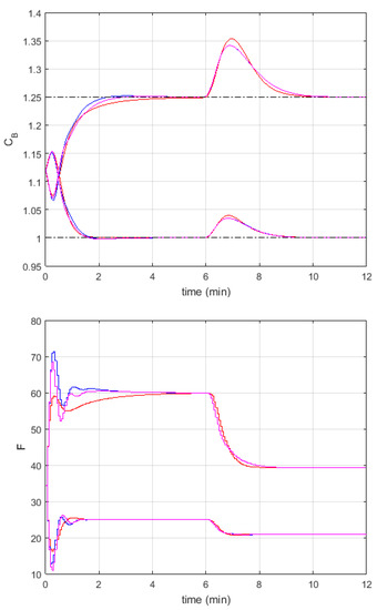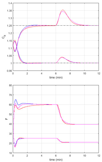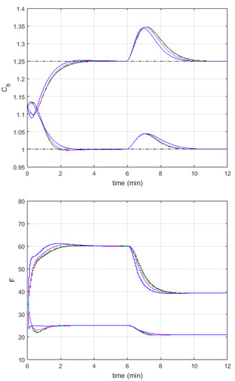The disturbance responses obtained with the FMPC2 and FMPC2a algorithms were practically the same (the same phenomenon was observed in the case of the FMPC1 and FMPC1a algorithms). Near mol/L and mol/L, the NMPC algorithm generated a bigger maximal error than the FMPC algorithms. In all three cases, there was no overshoot.