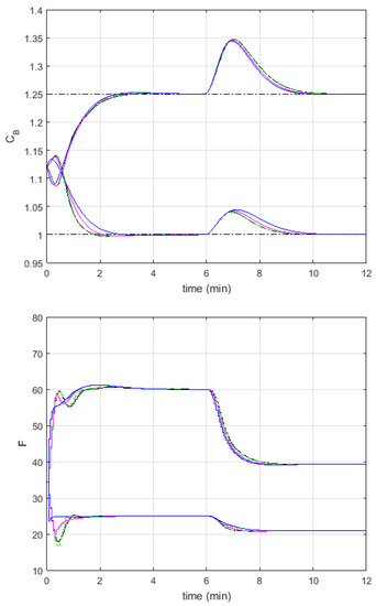 Responses of the control system with FMPC2a algorithm and to changes in the setpoint to mol/L and mol/L and to the change of the disturbance by 10% in the 6th minute of the experiment; —black lines (SSE = 1.2183), —green dashed lines (SSE = 1.2142), —magenta lines (SSE = 1.2220), —blue lines (SSE = 1.2218).