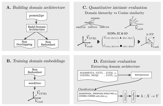 Our approach differs from [23] in four main points. First, we trained embeddings for all domain annotations of all proteins available in Interpro. That is, we included all available InterPro annotations, consisting of super-family, family, single domains, and functional sites, as “words” input to the word2vec method. Therefore, we used a broader set of annotations for the whole spectrum of organisms. Besides, word2vec was developed for sentences of natural languages, which have a moderate number of words. In order to copy with this assumption for the sentence length, we resolved overlapping and redundant annotations in order to increase the number of InterPro annotations, making our input more suitable for the word2vec method. Second, we benchmarked over the two word2vec models (CBOW and SKIP) and their parameters for each experiment of our quantitative intrinsic evaluation step, and consequently, we used our assessment to choose the best embedding space. Third, we established three unique intrinsic evaluation benchmarks for domain hierarchy, SCOPe secondary structure, and EC primary class. Lastly, our approach was also extrinsically evaluated on three downstream tasks in order to show that dom2vec embeddings can surpass or be comparable to state-of-the-art protein sequence embeddings.