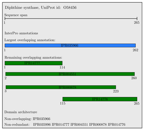 An example of the resulting domain architectures for the Diphthine synthase protein is shown in Figure 2. All domains are overlapping, with the largest one colored in blue, and the non-overlapping annotation is the single longest domain (IPR035966). All other domains have a unique InterProID; therefore, the set of non-redundant InterPro annotations includes all presented domains which are sorted with respect to their starting position, and colored in green.