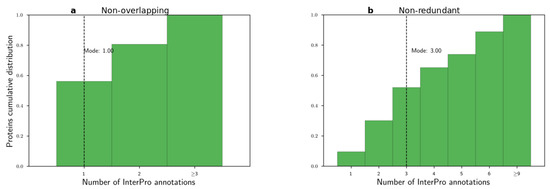 Histograms of number of InterPro annotations per protein. (a) Non-overlapping and (b) non-redundant annotations.