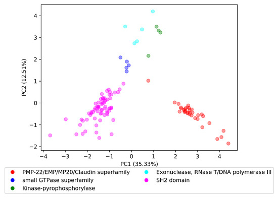 Evaluation First, we added the vector of each domain in a randomly chosen domain superfamily to an empty space. Then, we performed principle component analysis (PCA) [33] to reduce the space in two dimensions, and observed the formed clusters.