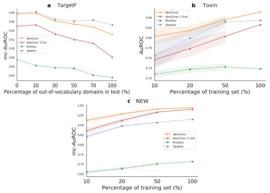 In addition, we assessed the learned by examining the performance change in downstream tasks. For the three supervised tasks, TargetP, Toxin, and NEW, the domain representations were used as input in simple neural networks. Next, our model performance was compared to the state-of-the-art protein embeddings, ProtVec and SeqVec.