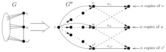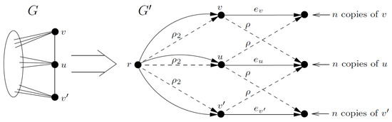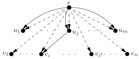 The reduction works as follows. From a given undirected connected graph of n vertices, we build a three-layered DAG . The first layer of contains the root vertex r (w.l.o.g., we can assume that ), the second layer of contains a copy of all the vertices of G, while the third layer of contains n copies of all the vertices of G. We observe that has vertices. The set of fixed-cost edges is the following: there is an edge of cost from r to every vertex in the second layer, and there is an edge of cost from a vertex u in the second layer to all the copies of vertex v in the third layer iff . The set P of leader’s edges is the following: there is an edge from r to every vertex in the second layer, and every vertex u in the second layer has an outgoing edge towards each of its copies in the third layer. An example of the reduction is shown in Figure 1.