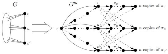 From , we build the DAG , which is obtained by replacing each edge by a path of n leader’s edges. Moreover, for every vertex and for every vertex v such that is a unit-cost edge of , we add the unit-cost edge to . As a consequence, there is a fixed-cost path of length from r to every . Figure 3 shows an example of the reduction. Observe that has vertices.