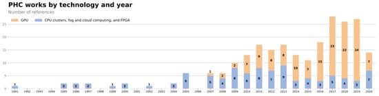 The review classifies the works into two groups: works where GPU is used and works that use CPU clusters, fog or cloud computing, or FPGA in power system studies and applications. This classification helps to organize the review since GPU applications represent more than half of all the articles. However, GPU applications are the most recent works of PHC techniques in power systems since 80% of the articles published during the last five years correspond to GPU implementations.