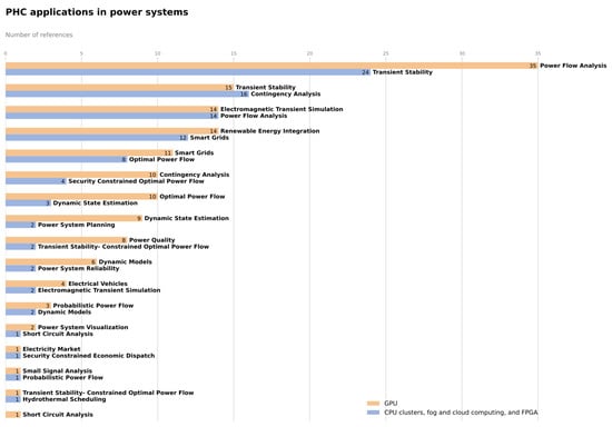 Power flow analysis is the application where PHC techniques have been most used, followed by transient stability and contingency analysis. Regarding power flow analysis, different technologies have been adopted to accelerate the tasks of the power flow algorithm, such as building the admittance matrix, or—regarding the Newton–Raphson method—computing the Jacobian matrix and updating the state variables. On the other hand, applications, such as electricity market analysis, small-signal analysis, security constrained-economic dispatch, and hydrothermal scheduling, are the situations where PHC techniques are not frequently used since they are the applications with the lowest number of references.