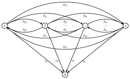 From the metric structure of the cost set, we have for all . Thus, the shortest path from node i to node 0 consists of either the arc connecting node i to node 0 with weight or the arcs connecting node i to some node j and node j to node 0 with weights and , respectively. Since for all , we have for all , and then for all with , from which the results follow. □