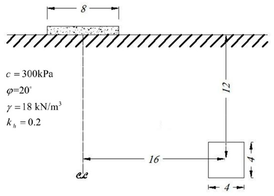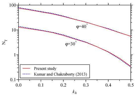 To validate the modeling approach, the results of some studies in the literature have been considered for comparison purposes. First, as seen in [57], the bearing capacity of the foundation has been computed via the lower bound FELA method, in case of horizontal seismic loadings. The relevant results are compared in Figure 3, in terms of the bearing capacity factor to show how they perfectly match the available ones. Second, a comparison with the studies of [57,58,59,60,61,62,63,64] has been made through the data gathered in Table 2. Such a comparison is provided in terms of the bearing capacity factor, at a varying value of the internal friction angle . The results again show a good agreement with those published, and correctly bound almost all of them. Third, in Table 3, a further comparison is provided for the bearing capacity factor allowing for the presence of a void at different depths beneath the strip footing central line, see [10,12,19]. It has been assumed that the opening width is equal to the surface footing width, and is located within an utterly cohesive soil at an undrained state with cohesion varying in the range kPa. Results are shown again to agree well with the reference ones.