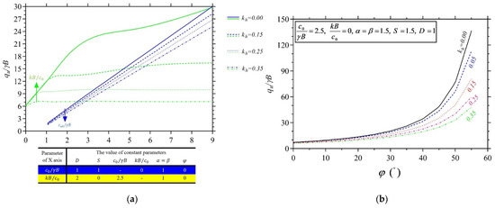 Parametric analysis: effects on the bearing capacity under different values of the seismic acceleration coefficient of: (a) the dimensionless soil parameters (blue plots) and (yellow plots); (b) internal friction angle .