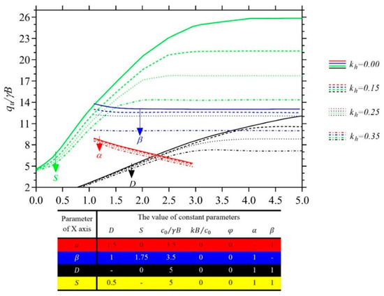 Parametric analysis: effects on the bearing capacity under different values of the seismic acceleration coefficient of the dimensionless void parameters (red plots), (blue plots), (green plots), and (black plots).