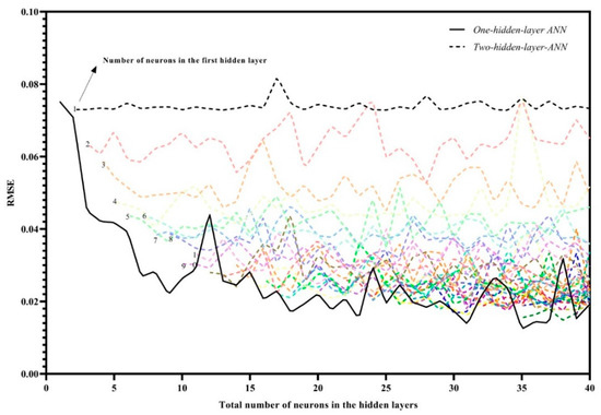 For our problem, a preliminary analysis has been performed to identify the optimal architecture of the MLP, in terms of the number of neurons in the hidden layers, to accurately describe the correlation between input and output of the analyzed dataset. In this regard, one-hidden-layer and two-hidden-layer ANNs have been investigated—to speed-up the optimization procedure, only 5% of the data has been adopted at this stage. To this aim, in [70], it was suggested that the ratio between the number of data and the number of input and output variables should be greater than five, to attain an appropriate performance of MLP—in the present case, the mentioned ratio results are which are much larger than the minimum value suggested.