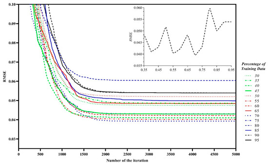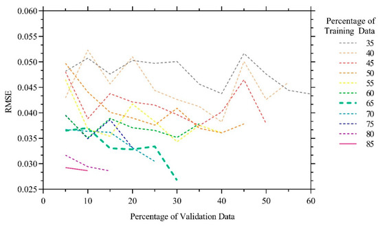 The effect of the proportioning of the data handled for training, validation, and testing of the MLP has been investigated next. As before, 5% of the data have been handled to evaluate the performance of MLP for different values of proportioning, and the results are shown in Figure 7 at varying values of the percentage of training data. The best performance has been obtained for 65% of the dataset employed for training, 30% for validation, and the remaining 5% for testing. Therefore, the numbers of samples used for the various stages of the MLP-based analysis are as follows: out of the total 38,000 data, 24,700 were used for training, 11,400 for testing, and 1900 for validation.