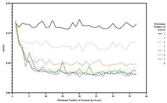 Even for this architecture, a preliminary analysis has been performed to identify the optimal values of the number of layers and of the maximum number of neurons in a layer, to enhance its effectiveness. Like for the MLP, for this stage of the analysis, 5% of the available data have been used. The effects of the aforementioned hyperparameters on the RMSE at the end of training are depicted in Figure 8. The graph shows that, when the number of layers is larger than six, the RMSE is only marginally affected. Moreover, it can be seen that an optimal value for the maximum number of neurons in a layer is 12. For values larger than this threshold, only a small variation of the RMSE is reported, which is arrived at by largely increasing the cost of training.