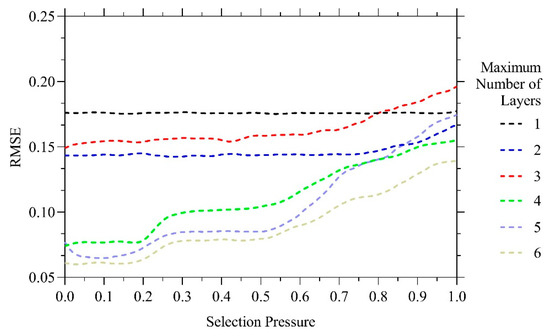 To run the GMDH algorithm, a parameter called “selection pressure”, which can be thought of as a threshold to determine the number of neurons in each layer, must be set. Its value ranges from zero to define the no-pressure mode (to select all the generated neurons), to one to define the maximum pressure mode (to select no neurons from all the generated ones). Hence, the lower the value of the selection pressure, the more complex the structure of the GMDH and the higher the related computational effort. A trade-off has thus been arranged, in such a way that its value does not negatively affect the performance of the algorithm while being maximized. According to the results collected in Figure 9, an optimal value of this hyperparameter has been set to 0.2.