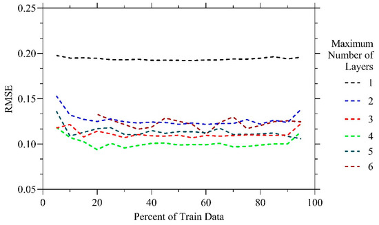 As for the MLP, the effect of data proportioning for training and testing has been investigated. Figure 10 shows that, independently of the number of layers, the percentage of training data does not significantly affect the GMDH performance. Therefore, 50% of the entire dataset has thus been selected for it.