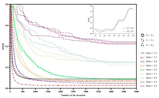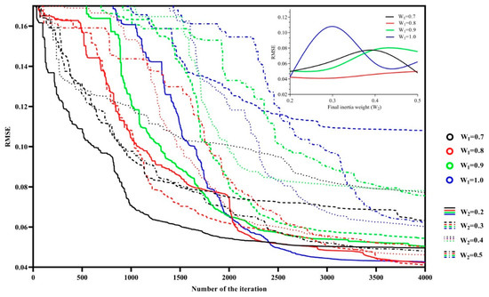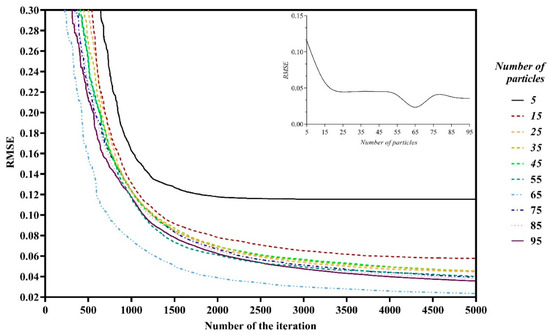 By setting the maximum number of iterations to 5000 and the number of particles varying in a range between five and 95, Figure 11 shows the evolution of RMSE. It can be seen that a number of iterations equal to 5000 looks appropriate to converge to the final solution, independently of the number of particles. As depicted in the inset of Figure 11, after 5000 iterations, the solution linked to 65 particles has shown the best performance.