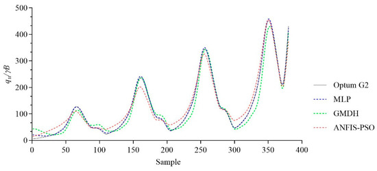 which has been assumed as the loss function to be minimized during the training. In Equation (3): is the total number of data; and for the -th model, is the load bearing capacity obtained with the Optum G2 software, whereas is the value estimated through the MLP algorithm.