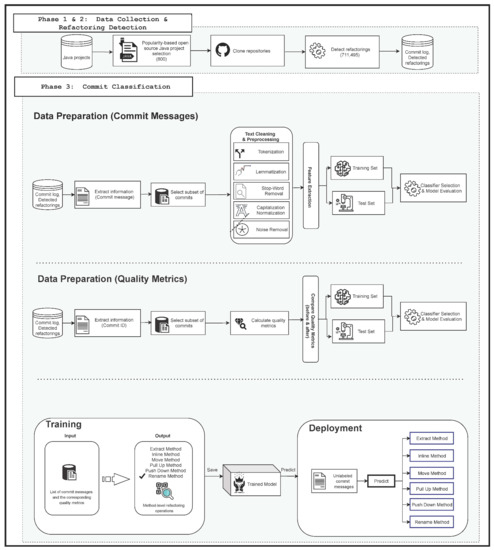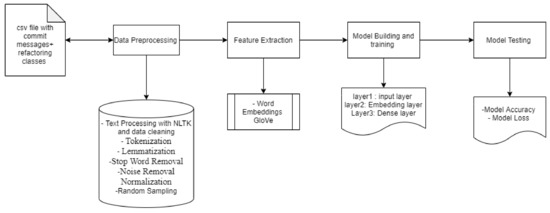 In a nutshell, the goal of our work is to automatically predict refactoring activity from commit messages and code metrics. In the data collection layer, we collected commits for projects from GitHub with web crawling for every project, and we prepared csv files with project commits and code metrics for further machine learning analysis. After this initial collection process, data were preprocessed to remove noise for model building. Extracting features helped us achieve results. Since we were dealing with text data, it was necessary to convert it with useful feature engineering. Preprocessed data with useful features were used for training various supervised learning models. We split our analysis into two parts based on our initial experiments. Only commit messages were not quite robust for predicting the refactoring type; thus, we tried to use code metrics. The following section will briefly describe the procedure used to build models with these three inputs.