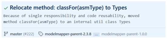 As an illustrative example, Figure 2 details a commit for which its message states the relocation of the method classFor(asmType) to an internal class utility class for the purpose of applying the single responsibility principle and code reusability link to the commit: https://github.com/modelmapper/modelmapper/commit/6796071fc6ad98150b6faf654c8200164f977aa4 (accessed on 20 September 2021). After running Refactoring Miner, we detected the existence of a Move method refactoring from the class ExplicitMappingVisitor to the class Types. The detected refactoring matches the description of the commit message and provides more insights about the old placement of the method.