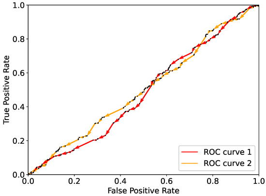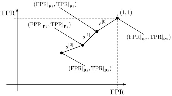 A curve can be constructed by joining the points contained in in ordered segments, where ordered segments means that the point will be connected to ; with ; and so on. The segment that joins the point with is denoted as ; the one that joins the points and is denoted as , and so on. In Figure 2, a curve obtained by joining the tuples given by the respective prediction vectors obtained with three flips is visualized to give an intuitive understanding of the process.