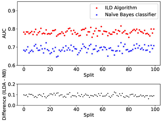To further test the performance, the split and training is repeated for 100 different dataset splits. Each time both the ILD algorithm and the Naïve Bayes classifier are applied to the validation set and the resulting AUCs are plotted in Figure 6 (top panel). For clarity, the difference between the AUC provided by the two algorithms is shown in Figure 6 (bottom panel).