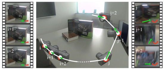 Two sequences of consecutive images within a video stream shot along a trajectory (white) around a scene to be 3D reconstructed. The left sequence (i, i + 1, i + 2) contains image quality well-suited for reconstruction but no significant change in the image contents. The right sequence (j, j + 1, j + 2) contains variation in viewing angle and parallax but the images are motion blurred due to heavy camera motion. The camera’s IMU tracks translational acceleration (green) and angular velocity (red) for each frame. A set of images well-suited for reconstruction can be selected solely based on the IMU data without time-consuming image analysis.
