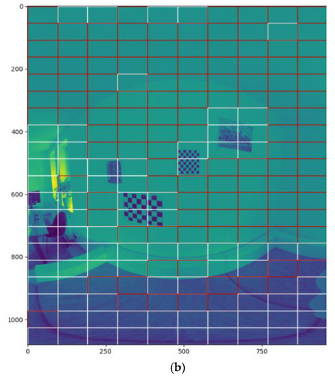 We investigated this measurement in more than 2500 frames, as seen in Figure 2 Finally, we set the mean of the standard deviation of all inspected frames as the threshold for regions of interest to omit homogeneous areas. Those computations were made on boxes of size 72 × 128 pixels per box, which relates to 15 × 15 boxes per frame, as seen in Figure 3a. Increasing the size of boxes would cover more homogeneous areas per box, which is not desirable. Decreasing the box size would produce insufficient robustness, recognizing homogeneous areas as heterogeneous, as one can see in Figure 3b.