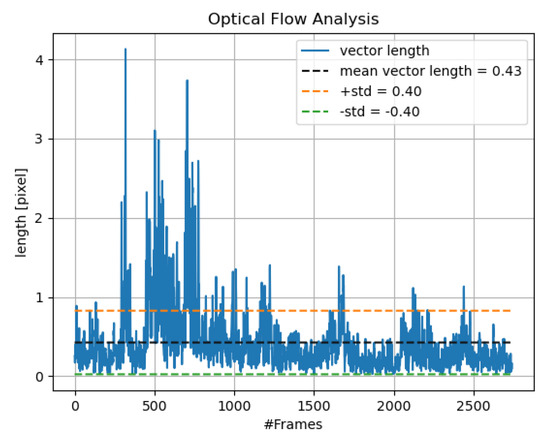 The recording provided over 2500 frames, as seen in Figure 4. The mean Euclidean distance of the optical flow vectors between frames was 0.43 pixels. According to the deviations in the analysis, we applied the standard deviation to increase the threshold and neglect non-significant motion due to shaking. Thus, we increased the threshold to 0.83 pixels, an example is shown in Figure 5.