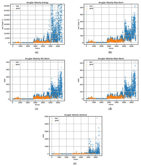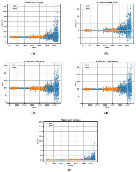 The labeled samples with respect to the features of acceleration were not clearly separable. While the acceleration sensor was only detecting gravity, measured values of both labels were superimposed. Thus, one cannot explicitly distinguish the difference between the good and bad class at the gravity’s magnitude. Motion was caused as far as the magnitude increased or decreased. Starting at about frame number 5000, there was significant motion as the magnitude decreased and increased; thus, the samples were labeled bad. However, samples were also placed at the gravity’s magnitude. Furthermore, the variance of the acceleration within a frame in Figure 5e was represented in stages. Unfortunately, the increase over motion according to the labels was weak and can be neglected. This behavior can be explained by the fact that an acceleration a of zero does not necessarily mean that there is no velocity v. Acceleration is described by , which states that acceleration is the change of velocity with respect to time, whereas the measurements of the angular velocity rather represented clear differences between samples. First, some samples of class good were recognized in the end where strong rotation was applied. On the other side, some samples were labeled as good while sharing the same magnitude as data that were labeled as bad. Nevertheless, the difference between the classes good and bad was clearly recognizable with the drawback of overlaps. Angular velocity and acceleration were independent of each other. Therefore, it was essential to rely on both inertial signals, independent of the feature, because motion can be described as translational, rotational, or both. If one only took translational motion into account, motion in terms of rotation would be neglected and omit further frames.