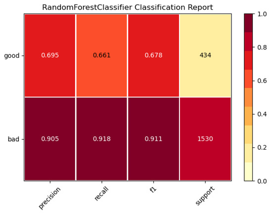Classification report with respect to the test set. Performance of class good underlies the performance of class bad.